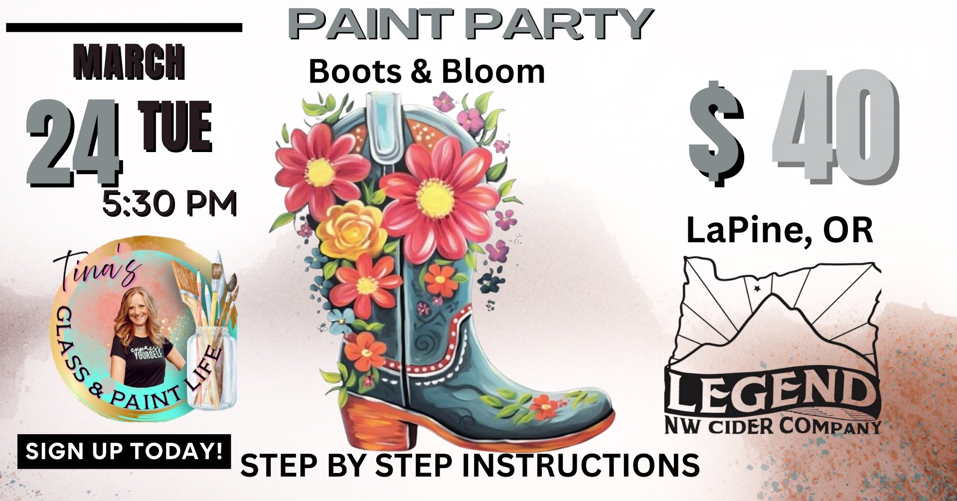 Join us at Legend Cider Co for a western-inspired paint night featuring this gorgeous floral cowboy boot design. Bold blooms, rustic charm, and the perfect pop of spring color — it’s a whole vibe!
